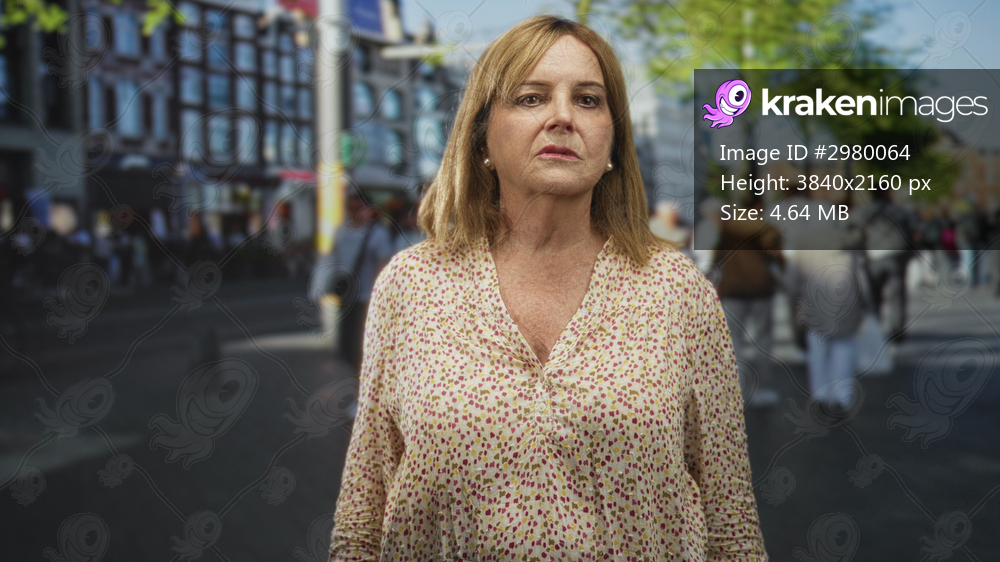 Woman standing facing camera in crowded city street wearing floral patterned blouse and pearl earrings; determination independence.