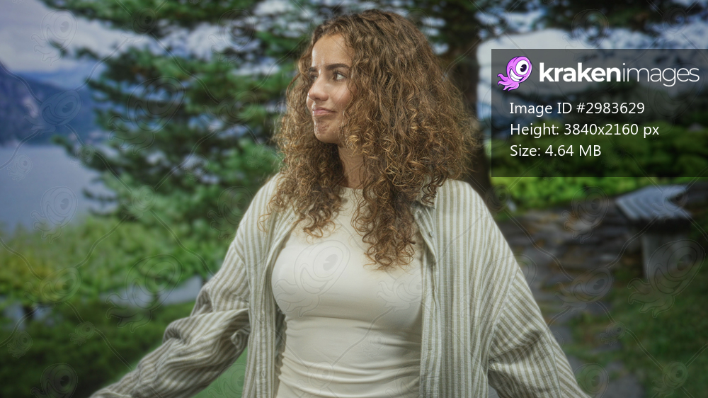 Woman standing facing camera with visible bust and curly hair on a forest path beside a lake and bench, wearing white top and striped cardigan; serene natural beauty. - Kraken Images