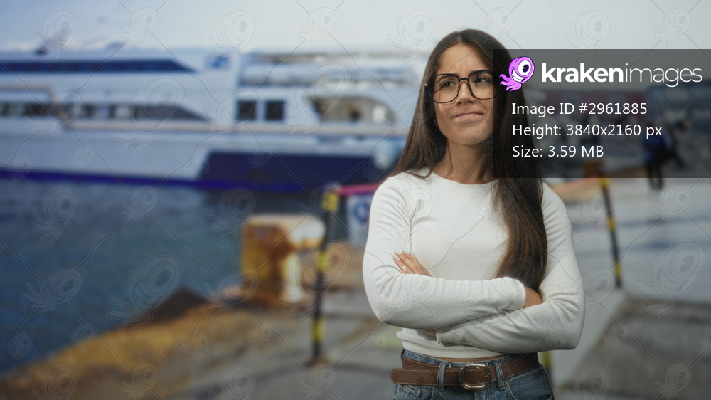Woman standing with folded arms in front of a boat on a pier backdrop in studio, wearing jeans and glasses, facing camera with a stern expression; defiance. - Kraken Images