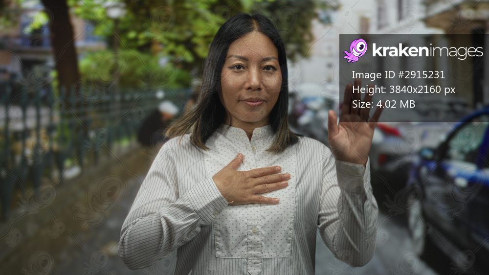 Woman standing with hand on chest on a city street near parked cars and iron fence, facing camera; gratitude reflection.