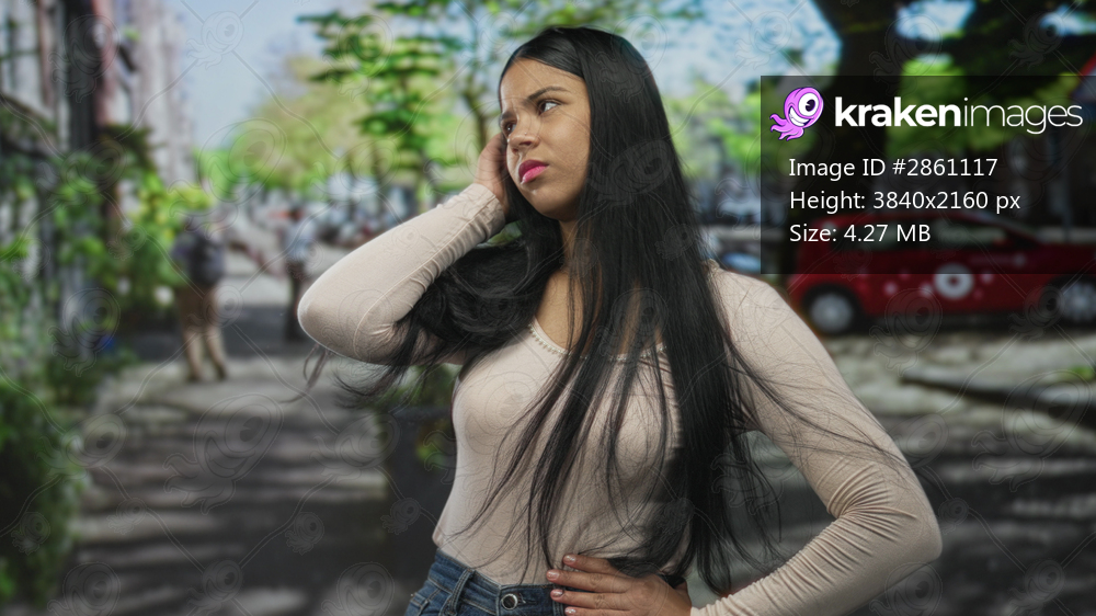 Woman standing with hand on chin in pensive gesture on street amid parked cars; reflection introspection contemplation concern.