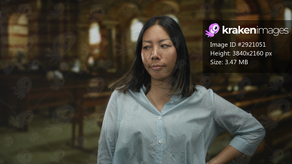 Woman standing with hand on hip in a church nave, wearing light blue shirt and glancing to the side; contemplation.
