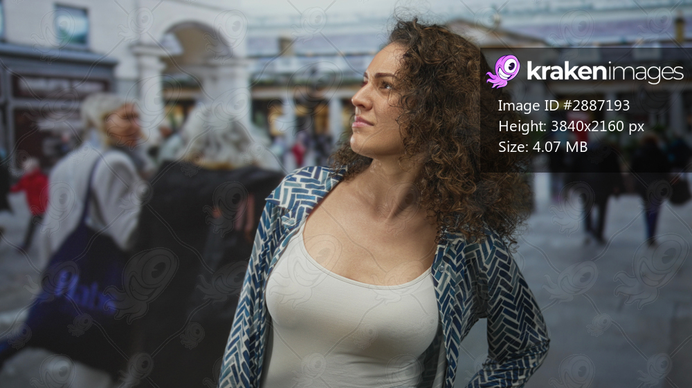 Woman standing with hands on hips and visible bust in patterned shirt on a busy city street with pedestrians nearby; confidence independence.