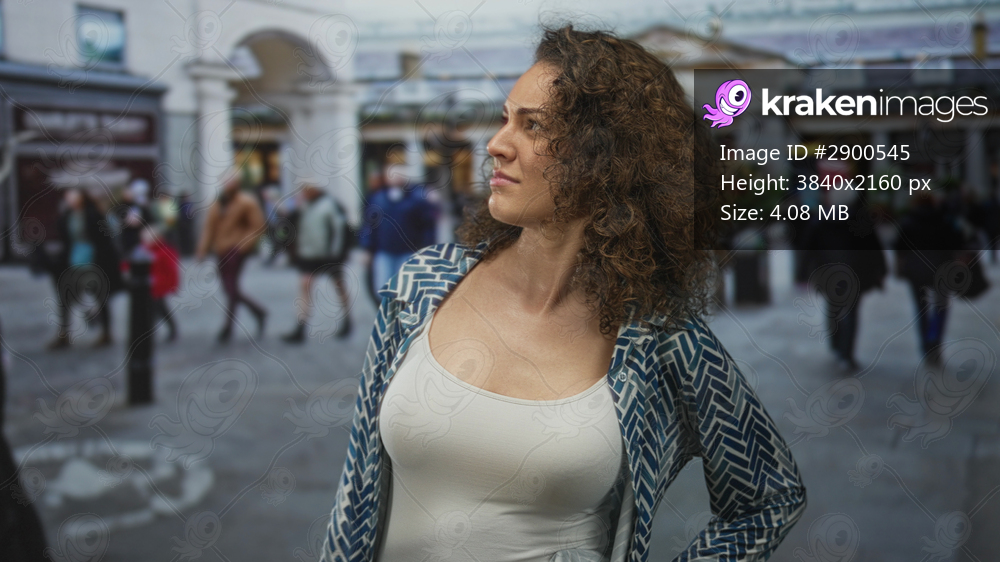 Woman standing with hands on hips and visible bust in patterned shirt on a busy city street with pedestrians nearby; confidence independence.