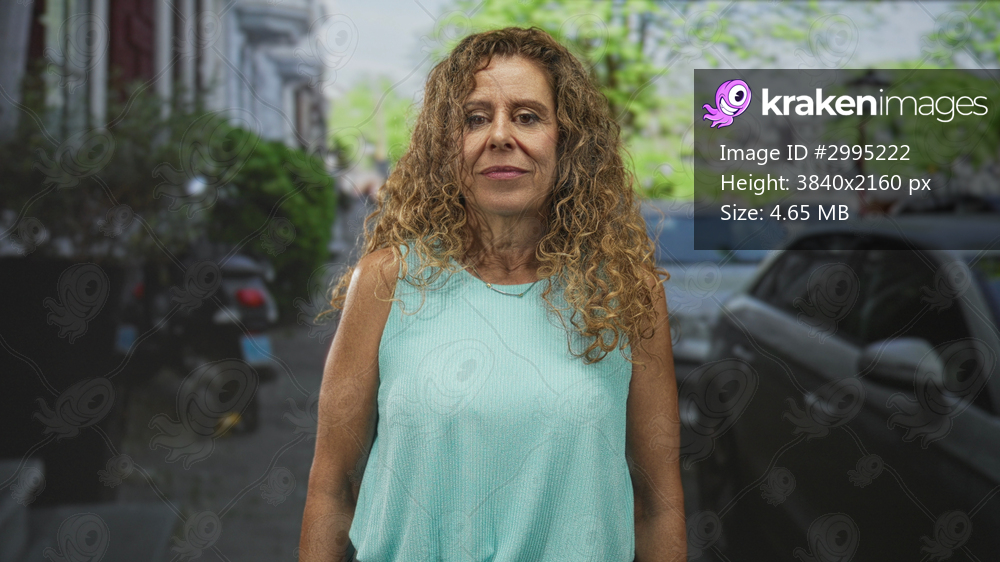Woman standing with hands relaxed in a sleeveless top on a street lined with parked cars and scooters; contentment.