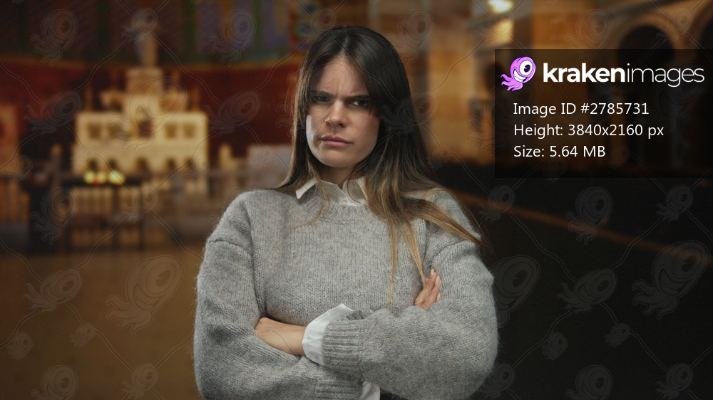 Woman standing in a church with arms crossed wearing a grey sweater looking serious, suggesting a religious context indoors with subdued lighting.