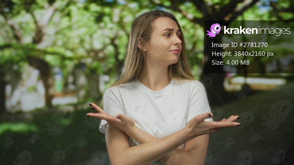 Woman standing in a green park, wearing a white shirt, gesturing with her hands, looking thoughtful, young adult posing outdoors on a sunny day, expressing different options visually. - Kraken Images
