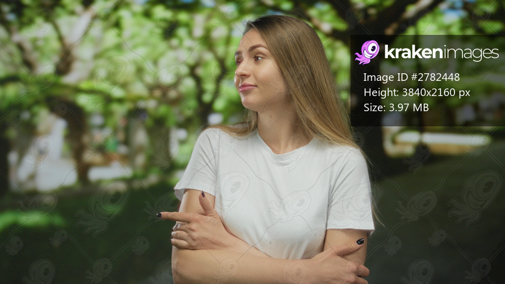Woman standing in a green park, wearing a white shirt, gesturing with her hands, looking thoughtful, young adult posing outdoors on a sunny day, expressing different options visually. - Kraken Images