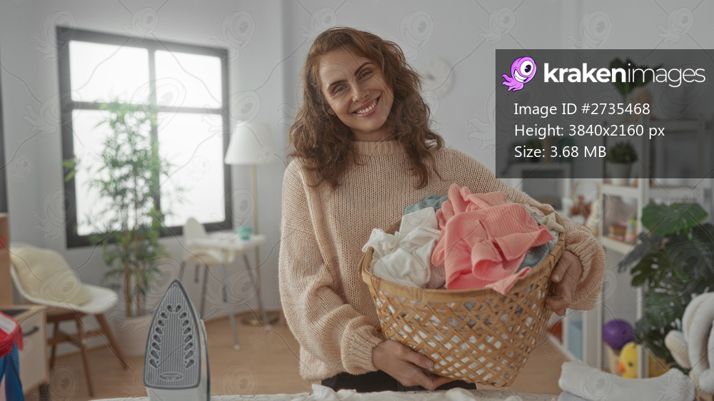 Woman standing in a home laundry room holding a basket of clean clothes, surrounded by ironing equipment and modern decor, exuding an organized and domestic atmosphere. - Kraken Images