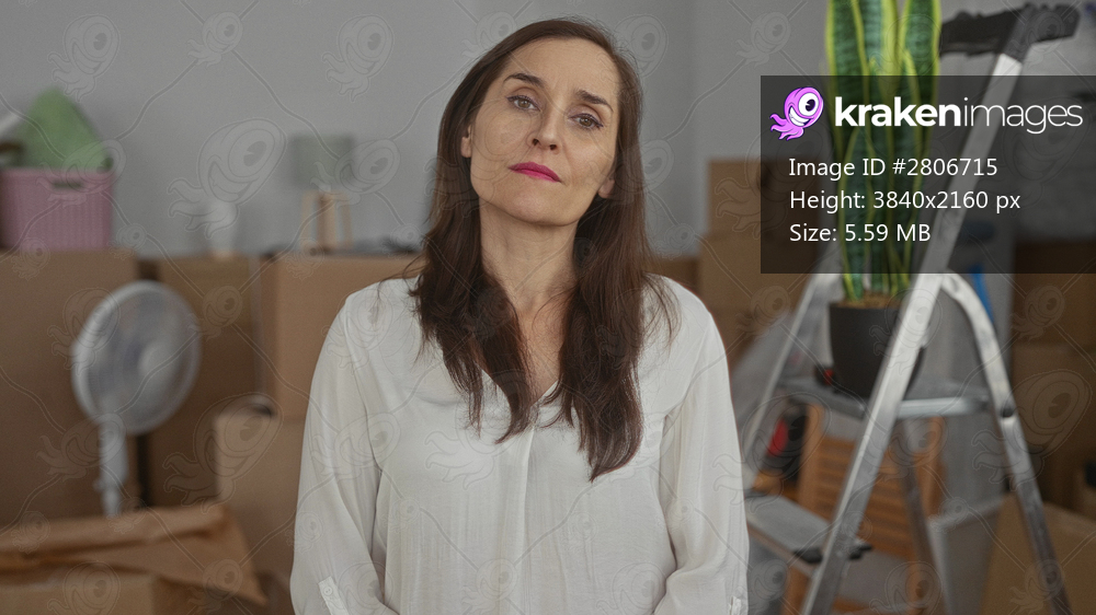 Woman standing in a new home surrounded by boxes and a ladder, indicating a moving day scenario, with a fan and plant adding to the indoor setting.