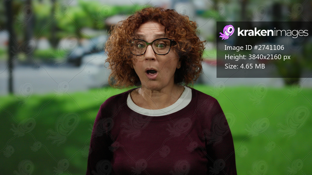 Woman standing in a park with curly brunette hair and glasses, expressing surprise in an outdoor setting with green grass in the background.