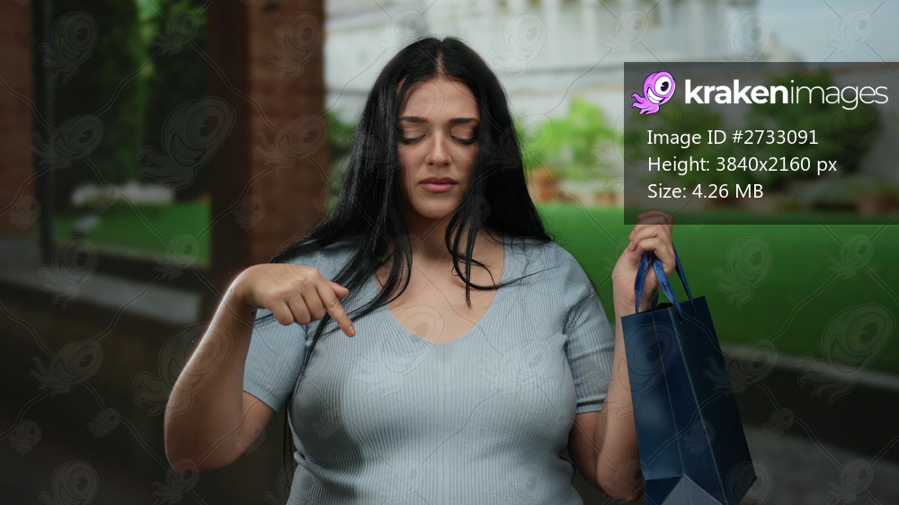 Woman standing in a park pointing downward with a serious expression, holding a blue shopping bag, showcasing a curvy plus size figure and long black hair outdoors. - Kraken Images