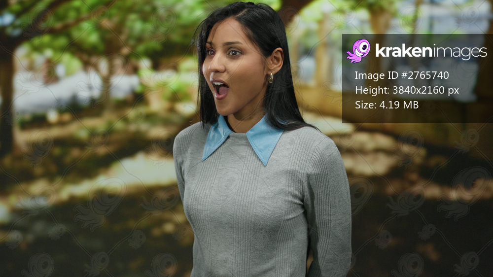 Woman standing in a park with trees in the background, displaying curiosity and surprise during a pleasant outdoor day under the sunlight.