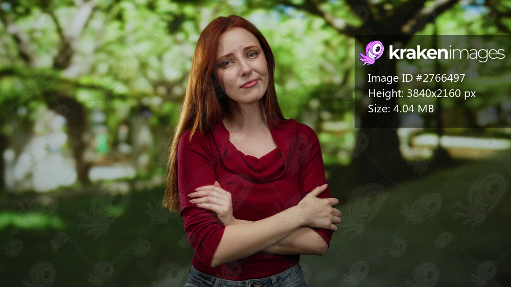 Woman standing in a sunny park with crossed arms, displaying an expression of curiosity and contemplation amidst lush green trees during a peaceful day. - Kraken Images