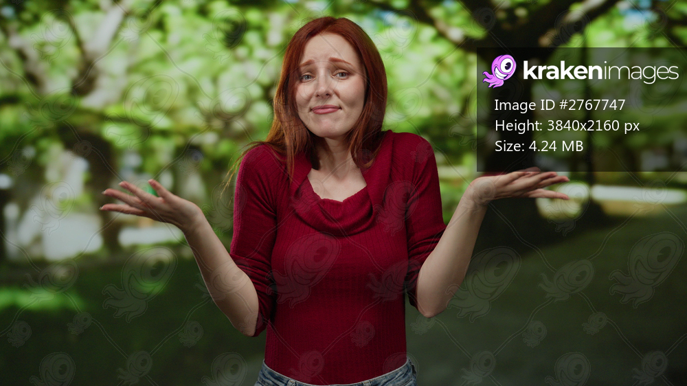 Woman standing in a sunny park with crossed arms, displaying an expression of curiosity and contemplation amidst lush green trees during a peaceful day. - Kraken Images