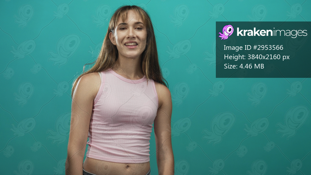 Woman standing in a teal studio wearing a pink crop top with exposed midriff and visible navel; youthful confidence.