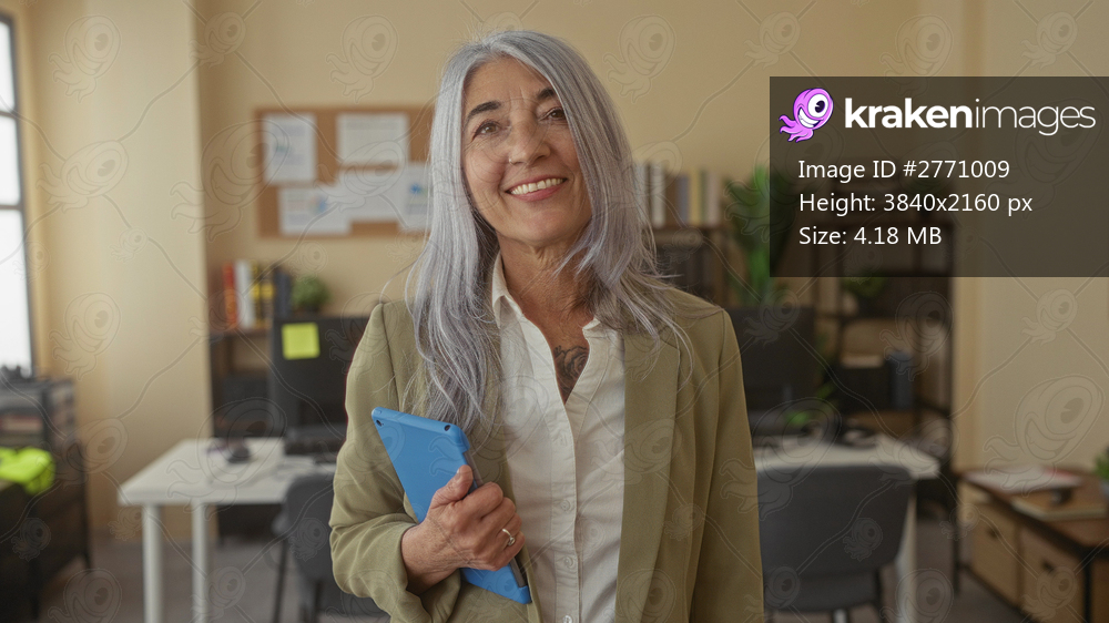 Woman standing in an office holding a tablet with grey hair, smiling, dressed in a blazer, showcasing a professional work environment with indoor setting and decor. - Kraken Images
