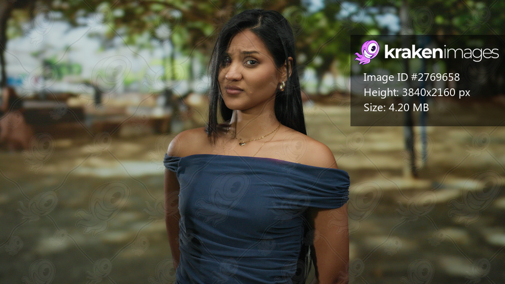 Woman standing in an outdoor park setting, showcasing a thoughtful expression with sunlight filtering through the trees in the background, creating a serene atmosphere. - Kraken Images