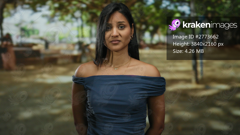 Woman standing in an outdoor park setting, showcasing a thoughtful expression with sunlight filtering through the trees in the background, creating a serene atmosphere. - Kraken Images