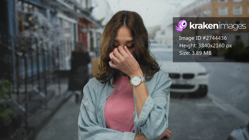 Woman standing in city street with hand on face, wearing pink shirt and denim jacket, white car in background, urban outdoor setting, distressed expression. - Kraken Images