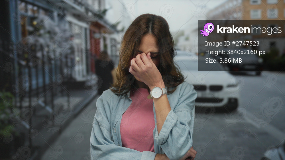 Woman standing in city street with hand on face, wearing pink shirt and denim jacket, white car in background, urban outdoor setting, distressed expression. - Kraken Images