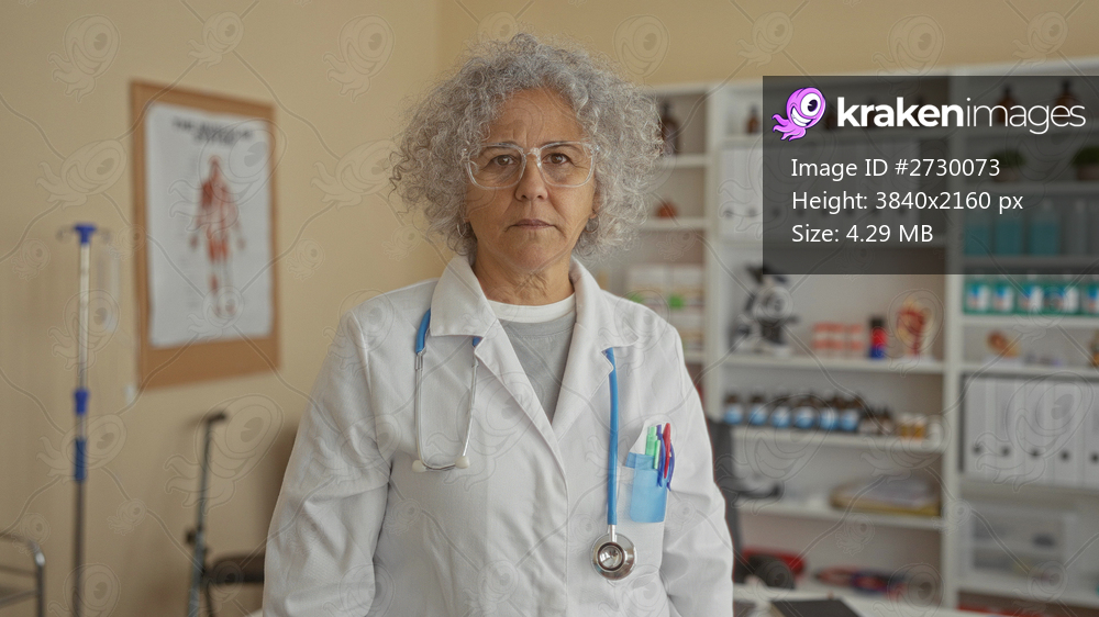 Woman standing in clinic wearing white coat and stethoscope, surrounded by medical supplies and grey hair looking professional in hospital room indoor setting. - Kraken Images