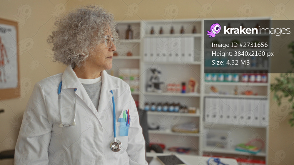Woman standing in clinic wearing white coat and stethoscope, surrounded by medical supplies and grey hair looking professional in hospital room indoor setting. - Kraken Images