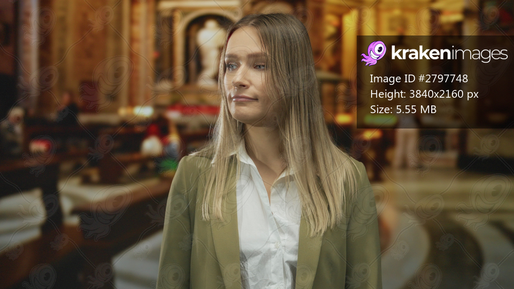 Woman standing in elegant church interior, surrounded by ornate architecture and wooden pews, conveying a serene ambiance with a subtle, thoughtful expression. - Kraken Images