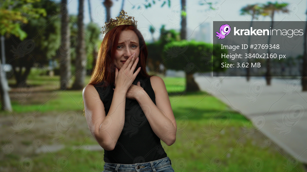 Woman standing in park wearing crown with hands on face looking concerned in sunny outdoor setting with green trees and pathway visible in background showcasing nature. - Kraken Images