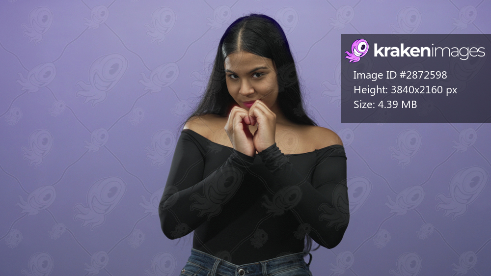 Woman standing in purple studio makes heart shape with her hands near face wearing off shoulder top and denim jeans; love affection.