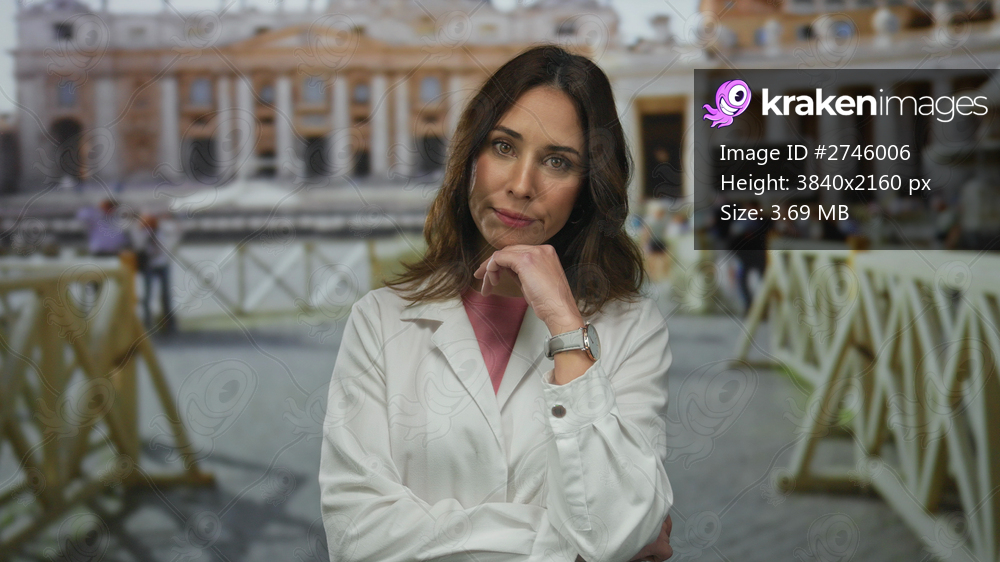 Woman standing in san pedro square, young hispanic woman wearing white coat against the vatican city backdrop outdoors, with people and architecture visible. - Kraken Images