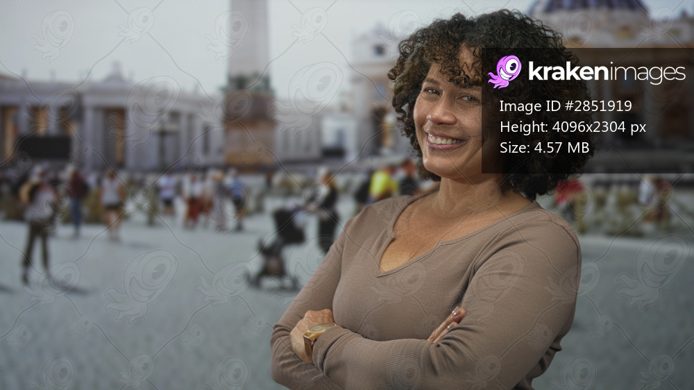 Woman standing in st peters square at the vatican proudly displaying cleavage and crossed arms; rejection.