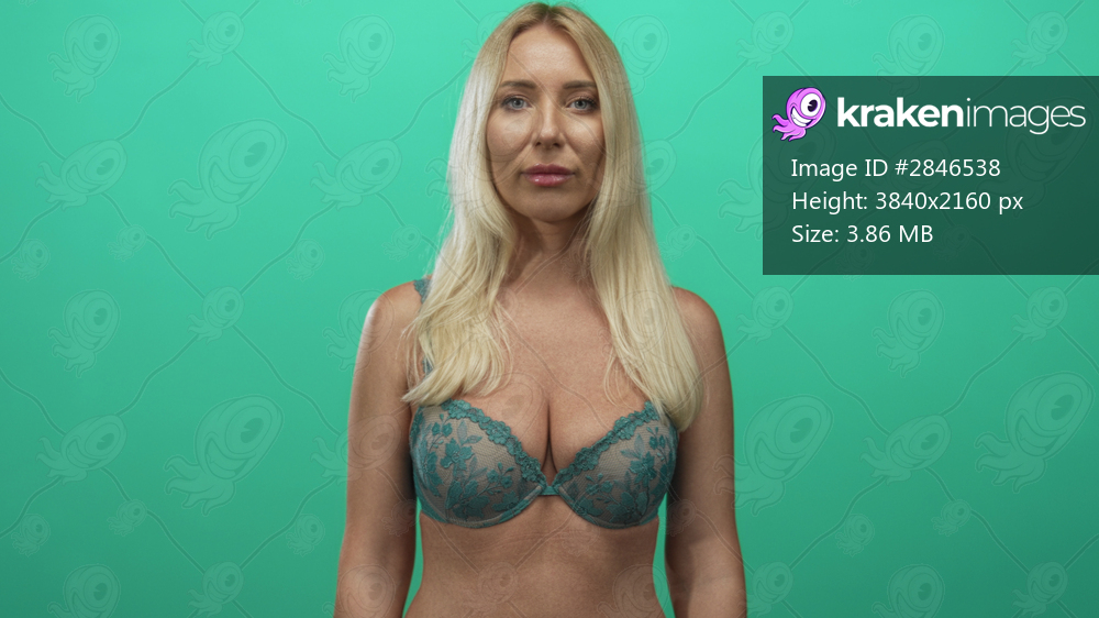 Woman standing in studio with visible cleavage in lace bra and long blonde hair, looking at camera; confidence.
