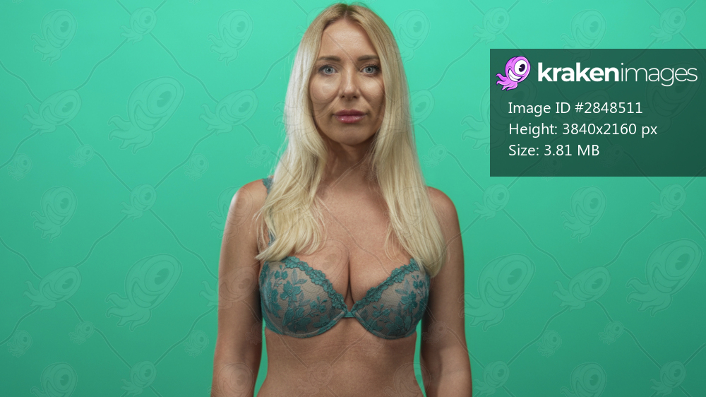 Woman standing in studio with visible cleavage in lace bra and long blonde hair, looking at camera; confidence.