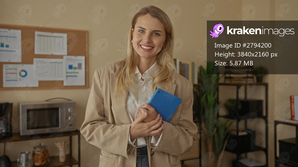 Woman standing indoor office holding tablet smiling blonde business workplace professional caucasian interior office decor modern.