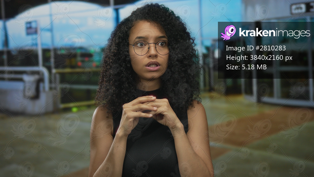 Woman standing indoors with glasses looks surprised in an airport terminal setting expressing emotion in a bustling public area