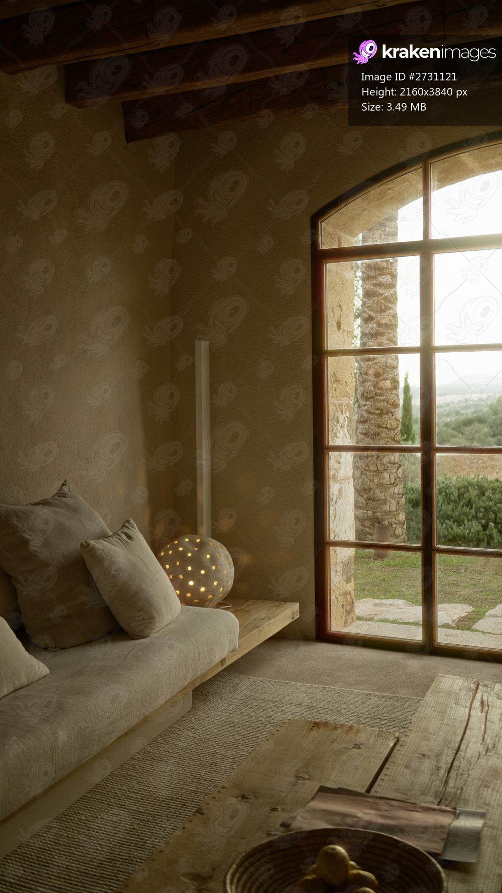 Woman standing indoors in a mediterranean house, illuminated by natural light from a rustic window, exuding elegance and sophistication with a serene ambiance. - Kraken Images
