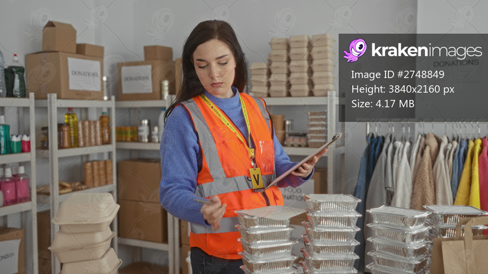 Woman standing indoors wearing orange vest organizing donations in a room with shelves of food and supplies showcasing volunteer work