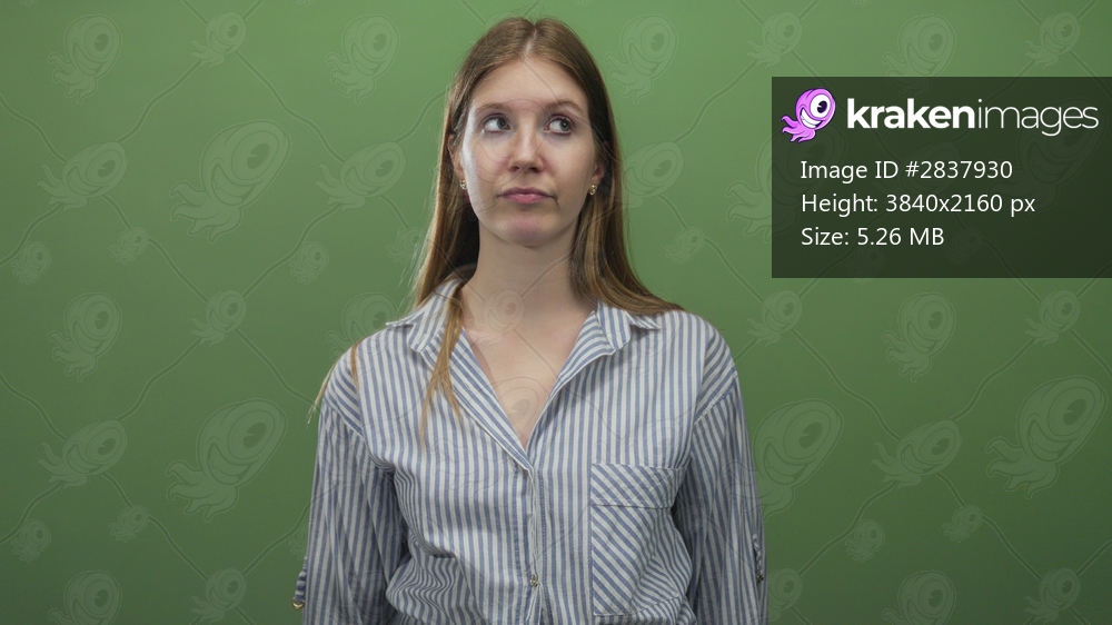 Woman standing making double air quotes with fingers in a green studio set; sarcasm doubt skepticism irony.