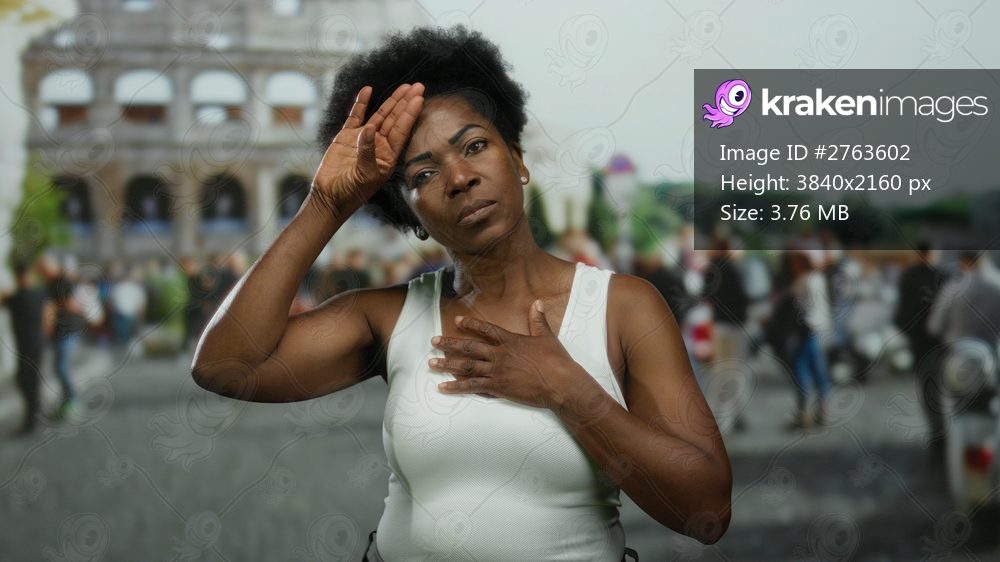 Woman standing near iconic roman coliseum looking tired with hand on chest wearing white top showcasing historical tourism in rome during daytime.
