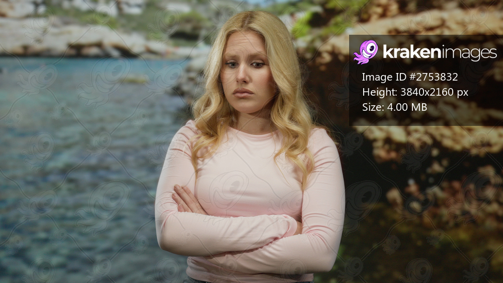 Woman standing on a beach with crossed arms, looking thoughtful while the sea breeze plays with her blonde hair against the serene backdrop of the ocean and rocky shore. - Kraken Images