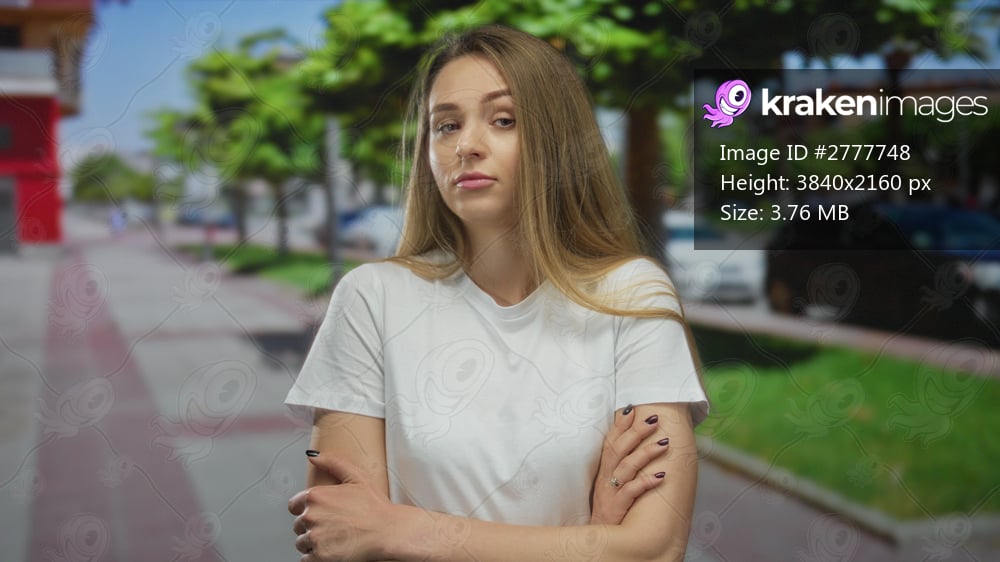 Woman standing on a city street with arms crossed, surrounded by trees and buildings, showcasing serene and focused expression in an urban outdoor setting. - Kraken Images