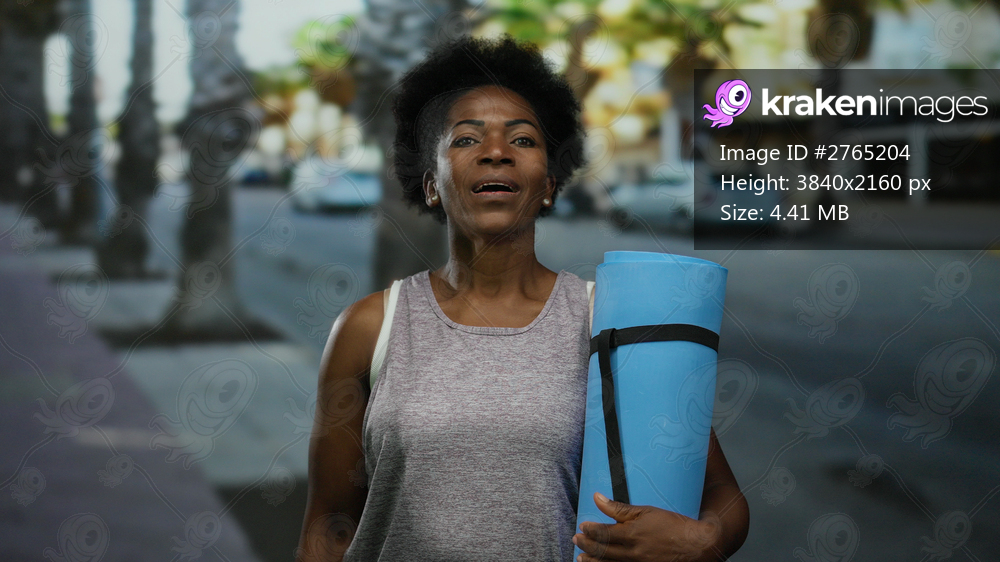 Woman standing on a city street holding a blue yoga mat, smiling confidently, suggesting an outdoor fitness lifestyle.