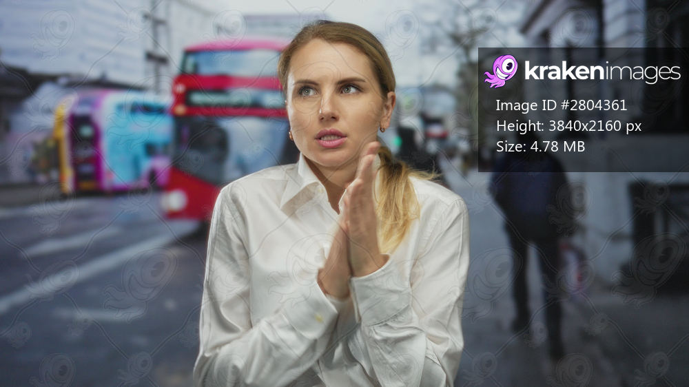Woman standing on a city street rubbing hands for warmth with a red bus passing by in an urban winter setting highlighting the chilly outdoor atmosphere. - Kraken Images
