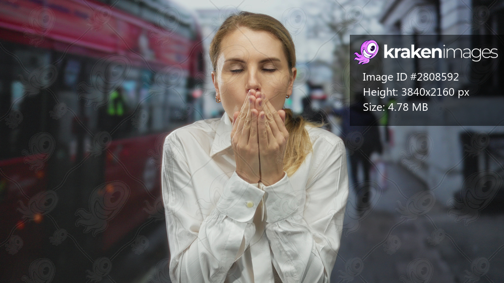 Woman standing on a city street rubbing hands for warmth with a red bus passing by in an urban winter setting highlighting the chilly outdoor atmosphere. - Kraken Images