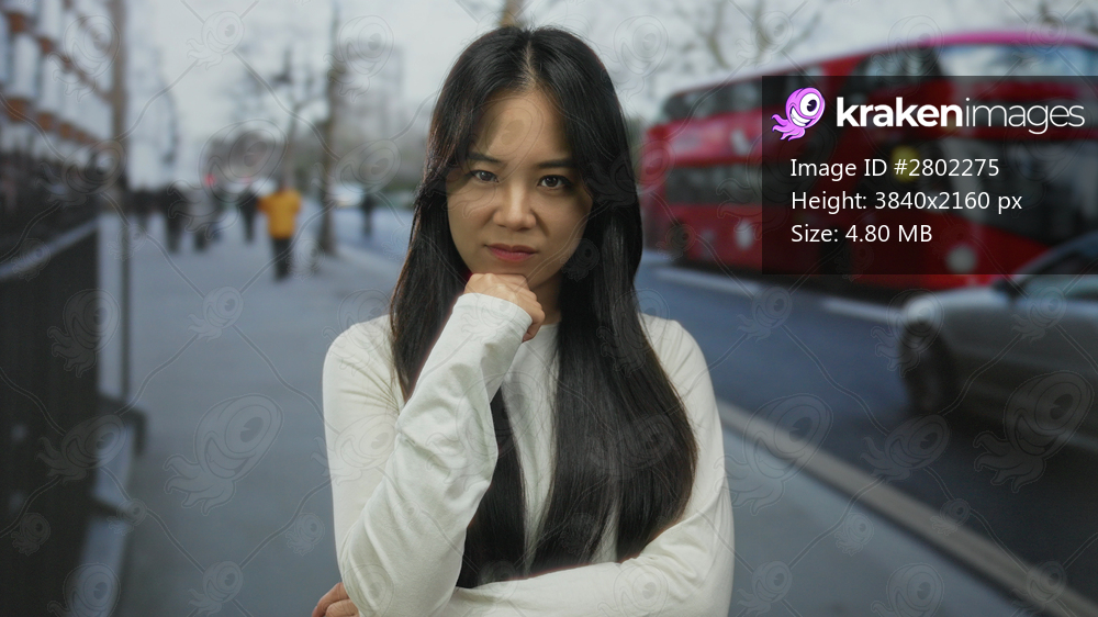 Woman standing on a street in london with red bus and cars passing by, wearing white shirt, expressing confidence and contemplation in an urban outdoor setting. - Kraken Images