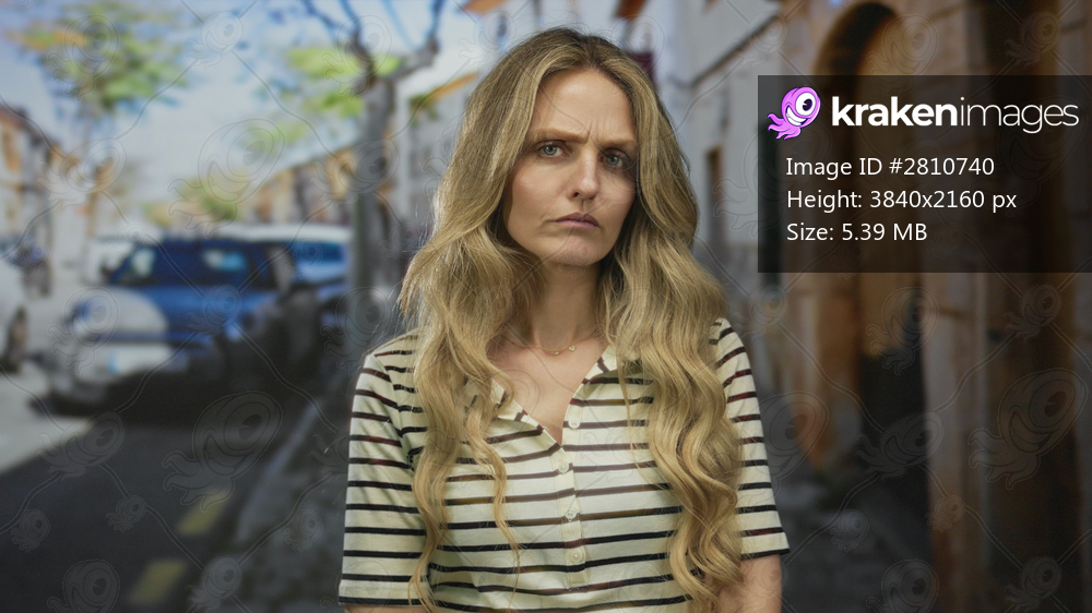 Woman standing on a street outdoors with long blonde hair in a striped shirt, surrounded by cars and buildings, expressing a serious demeanor in an urban setting. - Kraken Images