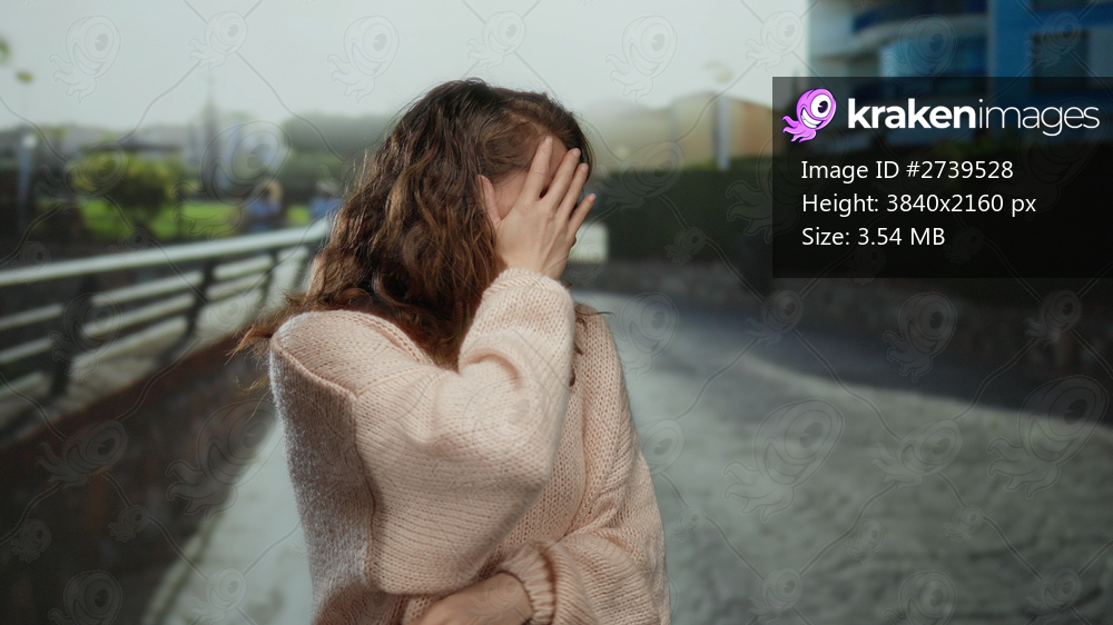 Woman standing on a sunny city street covering her face with her hands in a moment of distress, wearing a cozy pink sweater, surrounded by blurred urban scenery. - Kraken Images