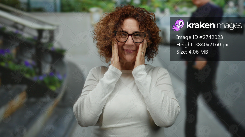 Woman standing on bustling city street, expressing surprise and joy with her hands on face, wearing glasses amidst an urban outdoor background with cars and people. - Kraken Images