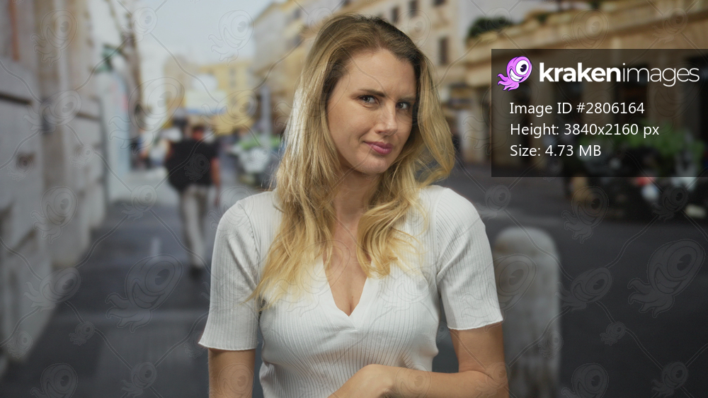 Woman standing on city street with blonde hair wearing a white shirt in a european setting outdoors during daytime.